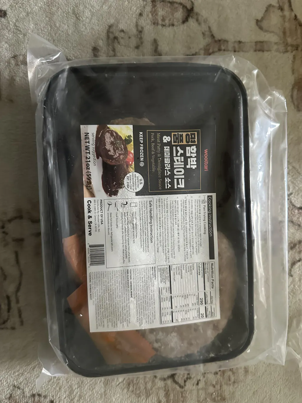 *맛있게 먹는방법: 전자렌지나 팬프라잉으로 간편하게 조리하신 후, 동봉된 데미글라스 소스를 살짝 데워 뿌려드시면 좋습니다. 조리한 패티 위에 계란후라이를 올리고 소스를 뿌려준 후 볶은채소, 밥 등을 곁들이시면 경양식 식당에서 즐기시던 함박스테이크를 가정에서도 그대로 재현 하실 수 있습니다.