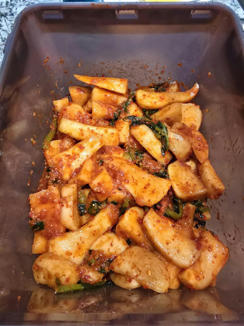 한입에 쏙 먹기 좋은 크기로 썰어낸 국내산 무에 황진담만의 특제 양념을 고루 입혔어요. 무의 시원하고 달큼한 풍미가 매콤 짭조름한 양념과 조화롭게 어우러져, 밥 한 그릇 뚝딱 비우게 만드는 기분 좋은 감칠맛을 선사해요.