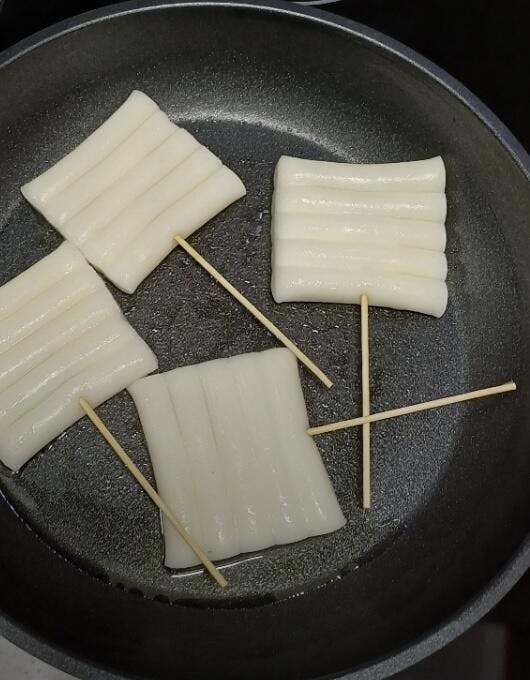 ② 예열된 프라이팬에 냉동상태의 떡꼬치를 넣고 앞뒤로 뒤집어가며 조리해주세요.
