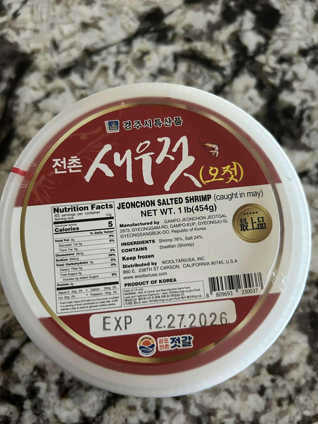 | 원재료명 | 국내산 - 새우 76%, 천일염 24% |