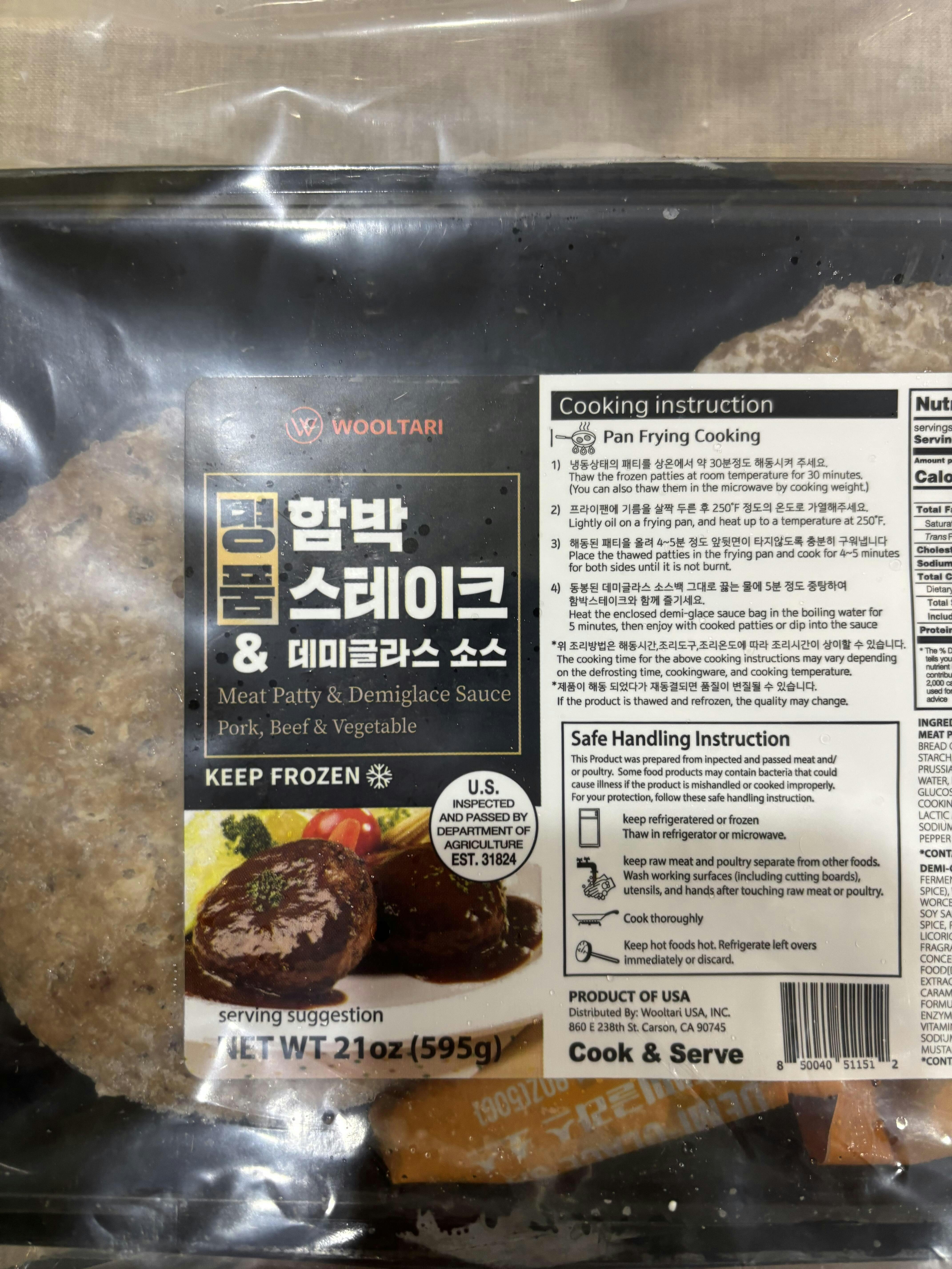 *맛있게 먹는방법: 전자렌지나 팬프라잉으로 간편하게 조리하신 후, 동봉된 데미글라스 소스를 살짝 데워 뿌려드시면 좋습니다. 조리한 패티 위에 계란후라이를 올리고 소스를 뿌려준 후 볶은채소, 밥 등을 곁들이시면 경양식 식당에서 즐기시던 함박스테이크를 가정에서도 그대로 재현 하실 수 있습니다.