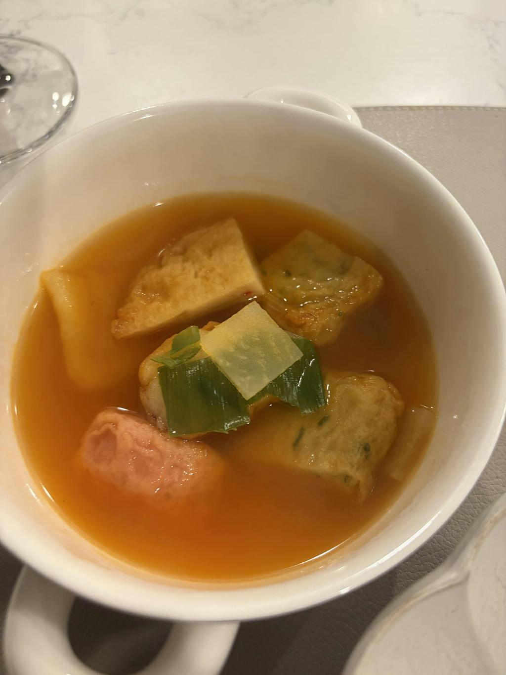 The rich chili based broth soaks into the savory fish cakes, delivering a deep, satisfying taste. Its refreshing spiciness balances the richness.