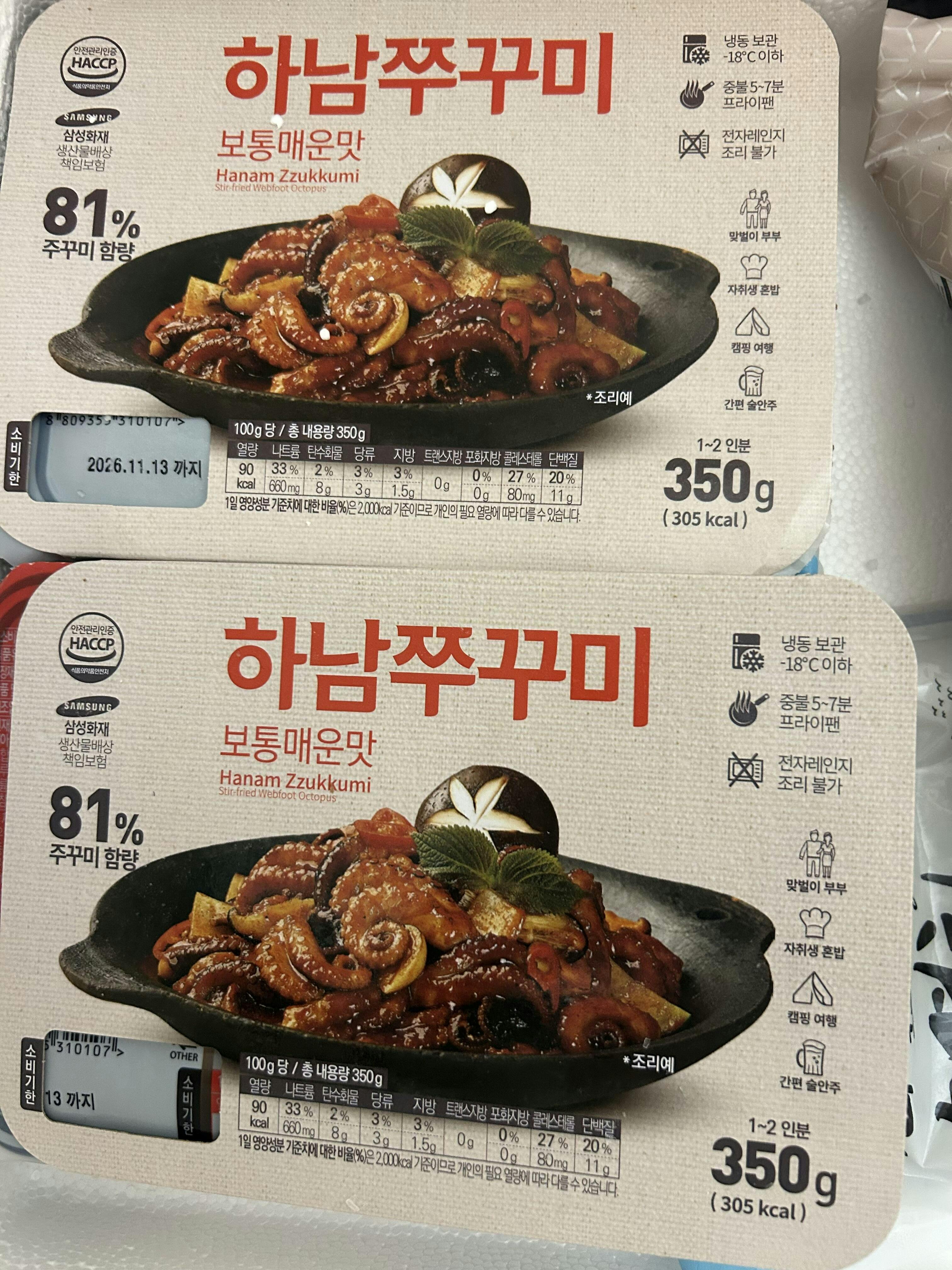| Ingredients | Stir-fried Octopus 81% (foreign: Vietnam, Thailand, Indonesia, etc.), red pepper paste [soybean paste {flour (wheat: American, Australian)}, starch syrup, spice preparation 1 (China), spice preparation 2 (China), refined salt (domestic)] ,Sugar, Red pepper powder: Red pepper (China), garlic, flavoring oil (edible oil), radish, L-sodium glutamate (flavor enhancer), mixed soy sauce, shiitake mushroom powder, onion, stir-fried sesame powder, black pepper powder |