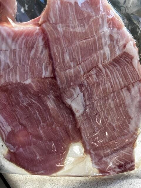 최고급 품질의 항정살 슬라이스 1lb을 소개합니다. 이 제품은 진공포장되어 신선함을 유지하며, 고기의 붉은빛을 띠게 하는 미오글로빈 색소에 산소가 공급되지 않아 어두운 색으로 변할 수 있으나 이는 품질과 무관합니다.