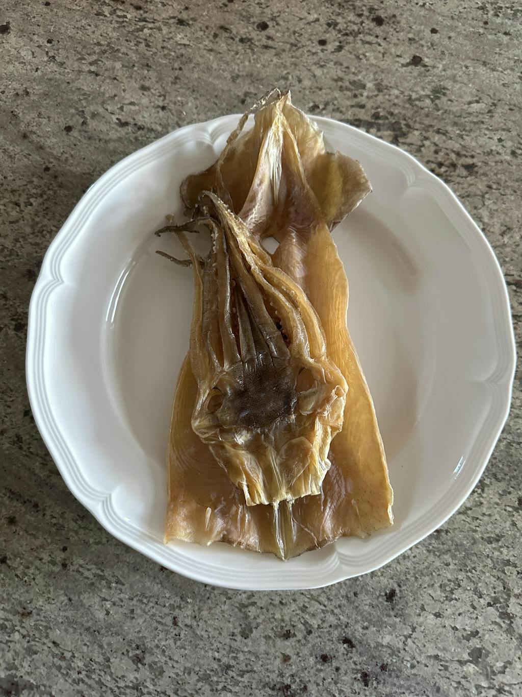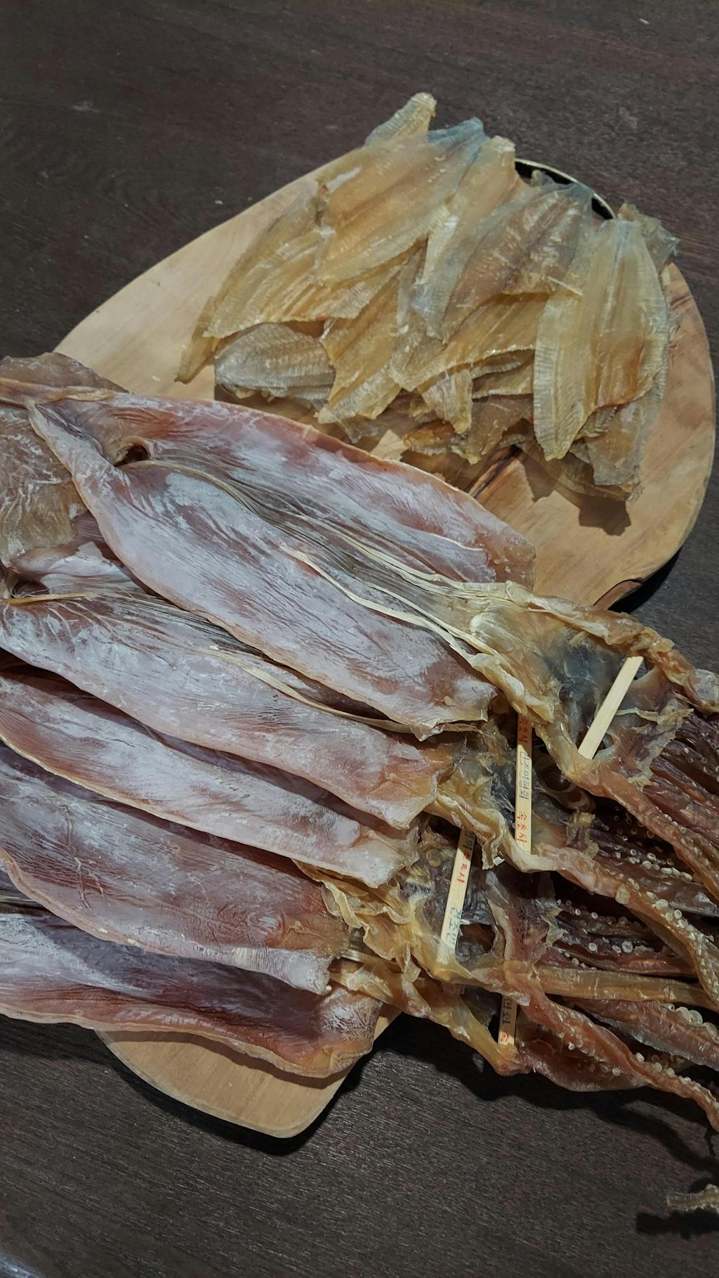 鱿鱼是 当天在东海捕捞到的鱿鱼,由于没有经过人工拉伸,外形丑陋,且皱巴巴的。相反,它并不咸,肉质厚实,有着鱿鱼独特的浓郁风味。