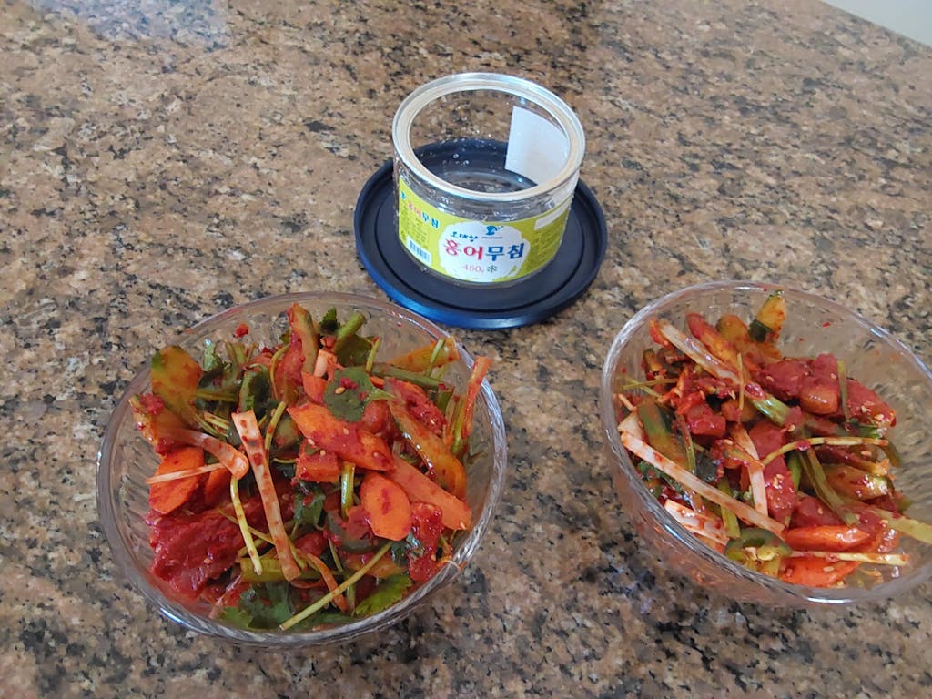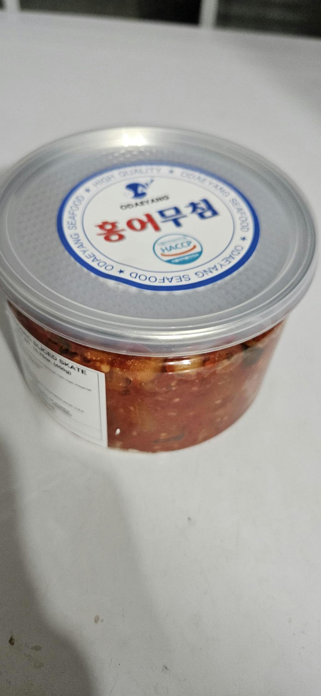 发酵的鳐鱼仅用环保成分和100%发酵醋调味。它具有嚼劲十足和独特的鳐鱼质地,配有美味的酸甜辛辣韩国酱汁。