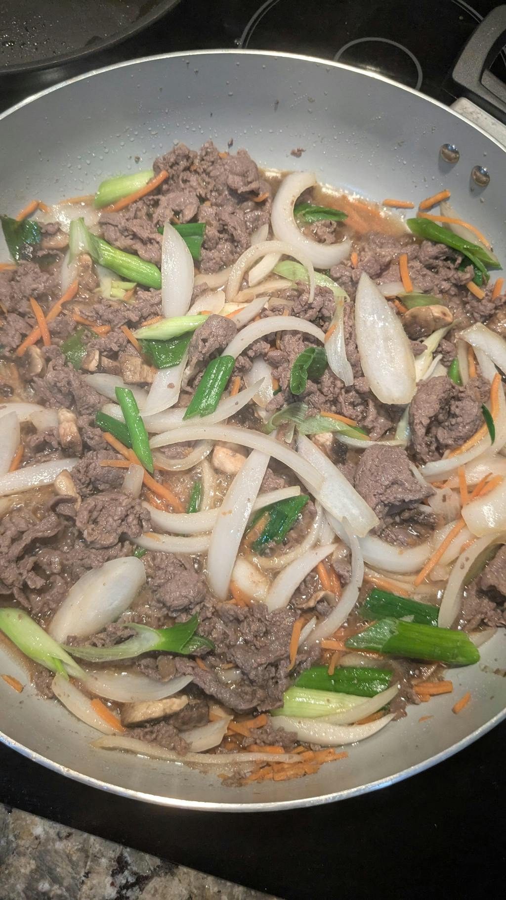 불고기에 간이 되어 있어서 양파, 당근, 버섯넣고 볶다가 파도 넣어서 맛있게 먹었어요.