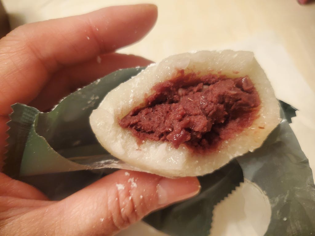 这是一种正宗的传统糯米年糕,里面填充了甜红豆沙。
