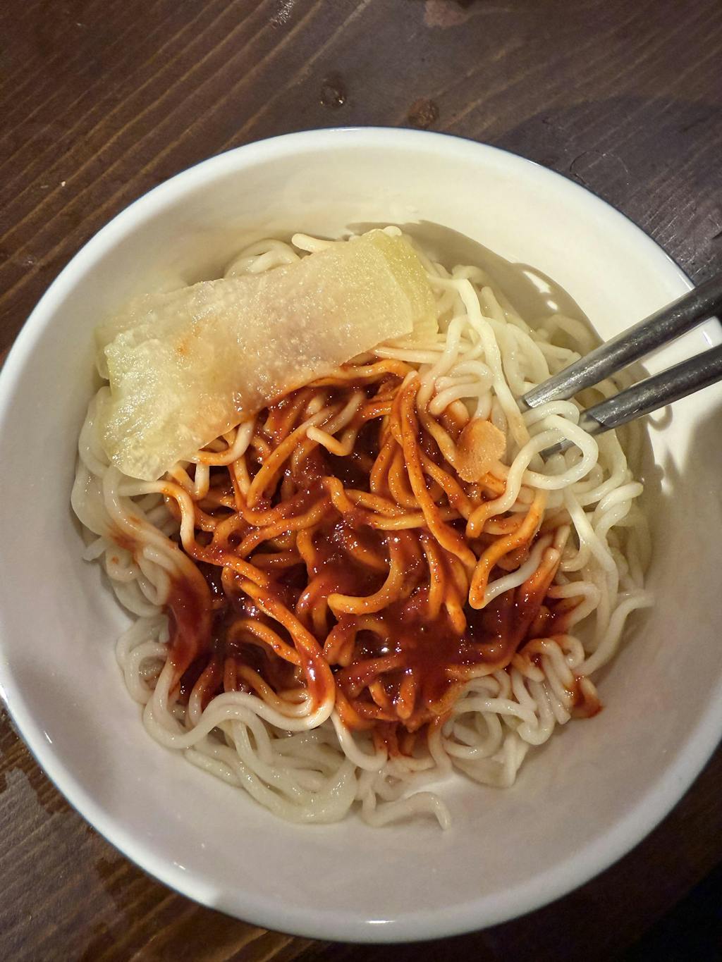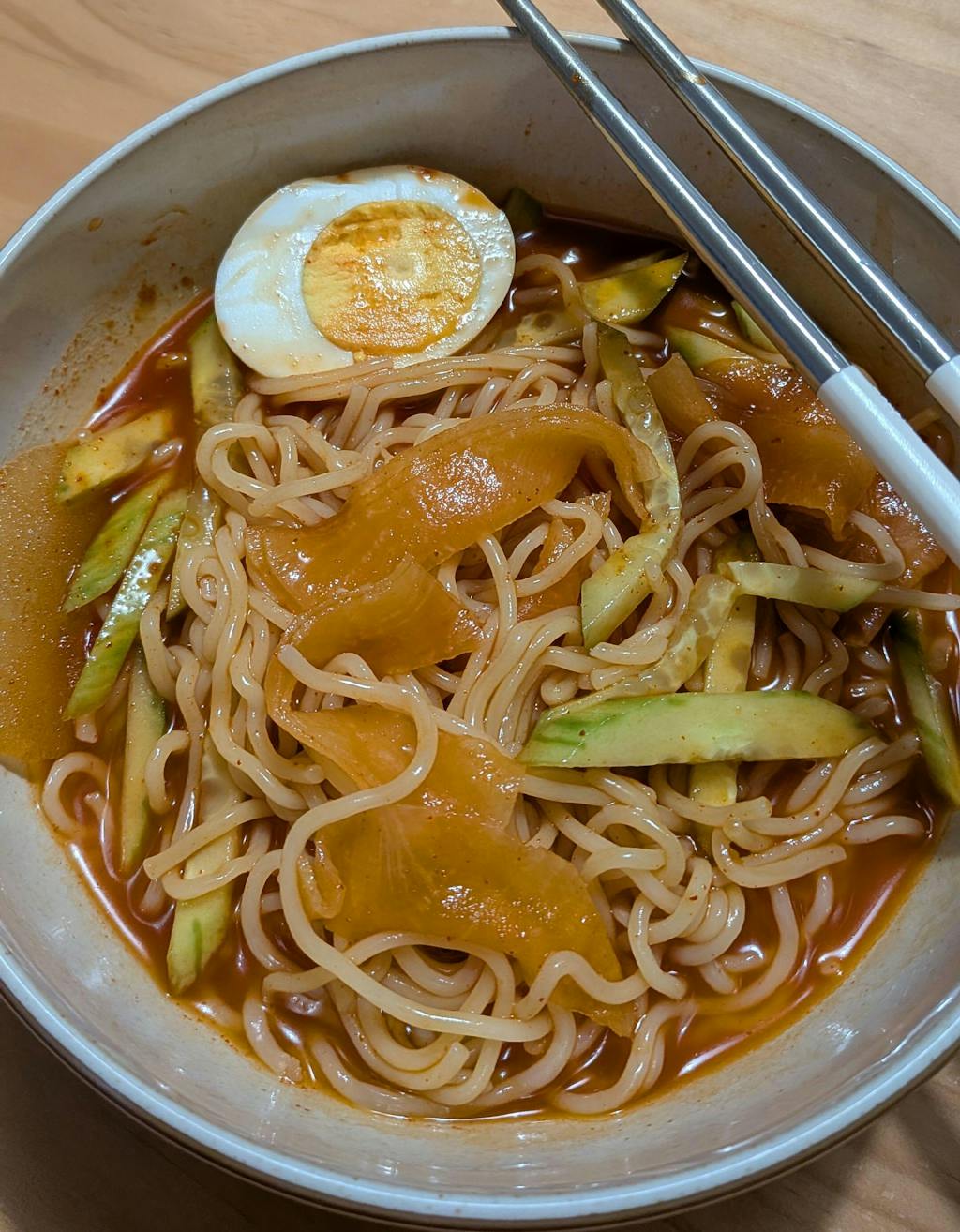 济州风格的拌冷小麦面配有清凉的汤底,辛辣和酸味令人着迷。